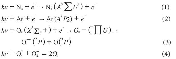 通過等離子體輻射的紫外光高能電子與中間氣態(tài)分子混合相互作用,這些由電子激發(fā)產(chǎn)生的活性物質(zhì),即參加反應的活性種粒子,其產(chǎn)生過程如下: