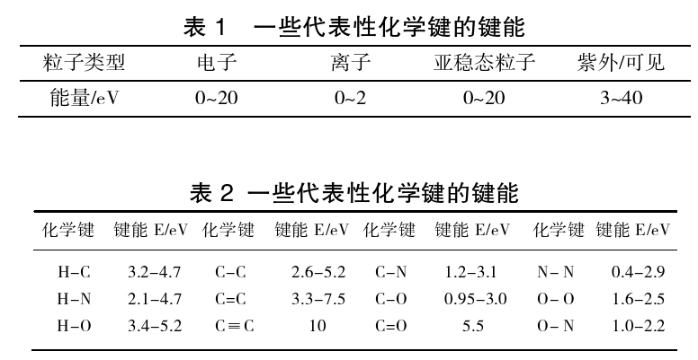 在等離子體對材料表面進(jìn)行改性的過程中,通常情況下通過撞擊材料表面,使材料表面原有化學(xué)鍵斷開以形成新的化學(xué)鍵。等離子體中各粒子能量參數(shù)范圍如表1所示,表2為各類材料中一些化學(xué)鍵鍵能。將二者對比得出:除離子外,等離子體中的大多數(shù)離子能量均高于表格中化學(xué)鍵鍵能。這表明,利用等離子體可以破壞材料表面的化學(xué)鍵而形成新的化學(xué)鍵。